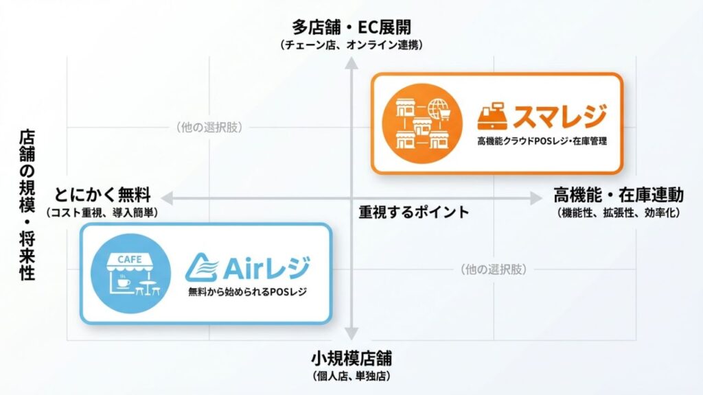 在庫管理を徹底して多店舗展開やEC連携を見据えるなら「スマレジ」一択であり、小規模な店舗でまずはコストをかけずにシステムを導入したいなら「Airレジ」を選ぶのが正解です。
