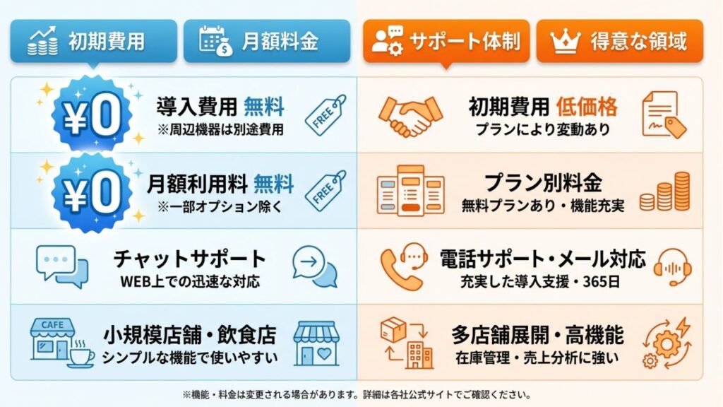 公式サイトの機能一覧表を眺めても、結局のところ自分の店舗にどちらが合っているのか、決定的な違いが分かりにくいのが現実です。